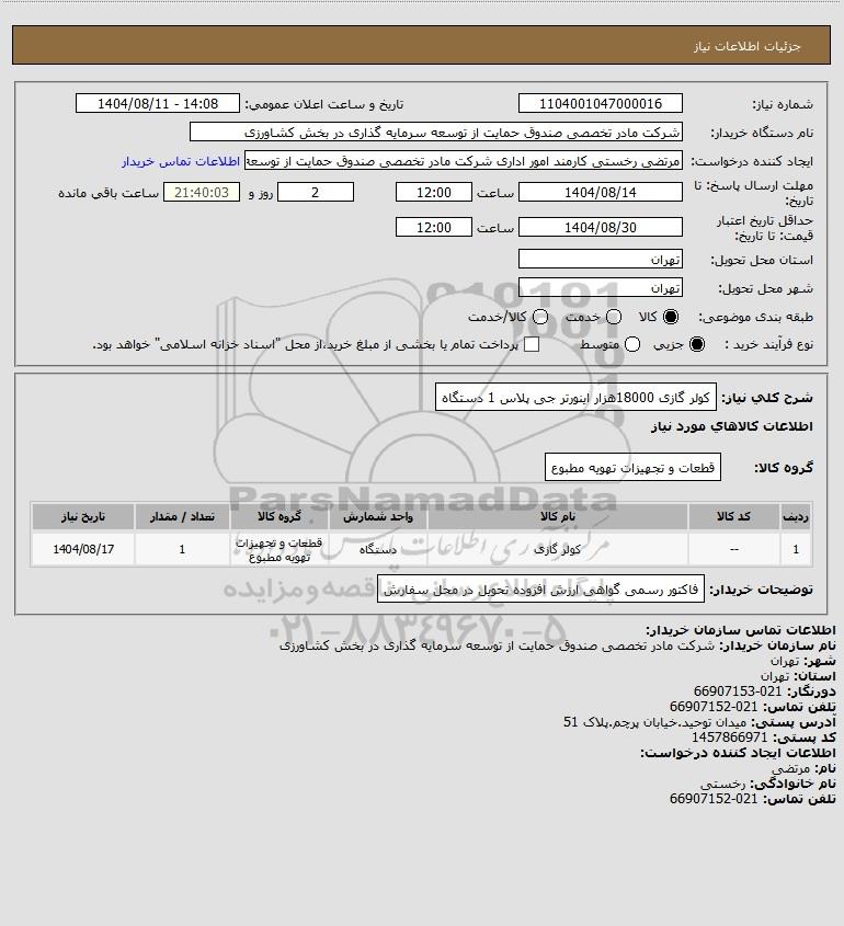 شرح کلی نیاز: کولر گازی 18000هزار اینورتر جی پلاس 1 دستگاه