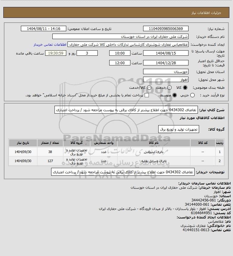 | 2 | -- | باتری وسایل نقلیه | عدد | تجهیزات تولید و توزیع برق | 127 | 1404/09/30 |