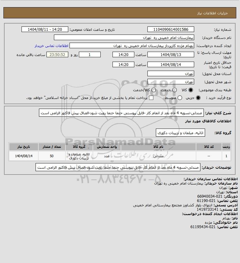 | 1 | -- | صندلی | عدد | اثاثیه، مبلمان و تزیینات دکوری | 50 | 1404/08/14 |