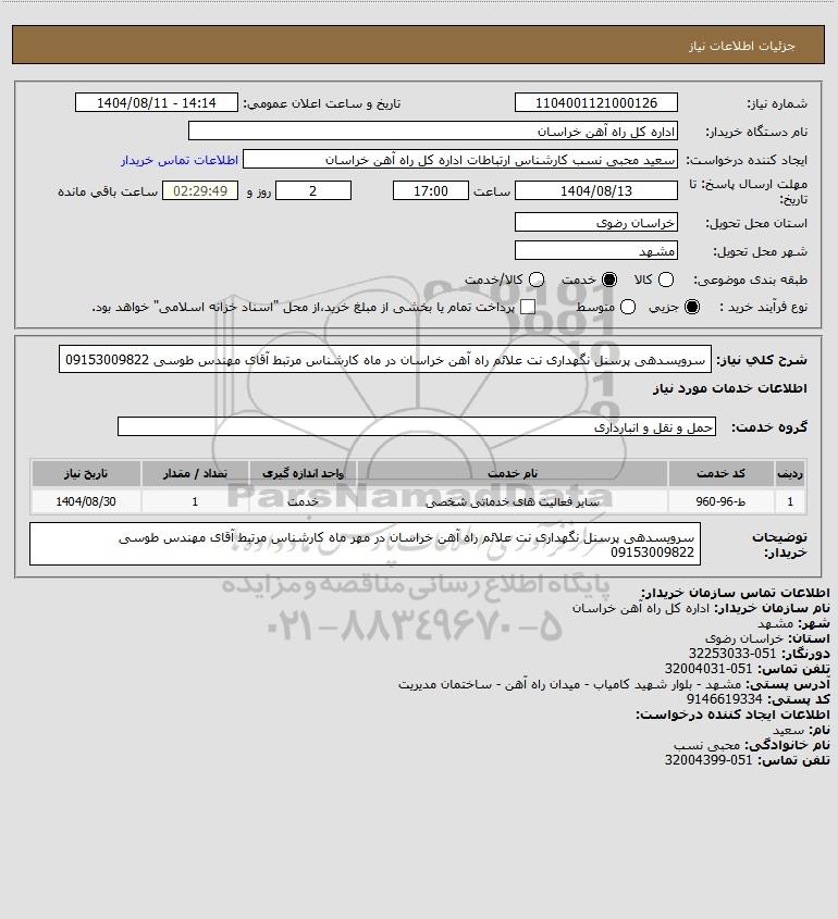 شرح کلی نیاز: سرویسدهی پرسنل نگهداری نت علائم راه آهن خراسان در ماه کارشناس مرتبط آقای مهندس طوسی 09153009822