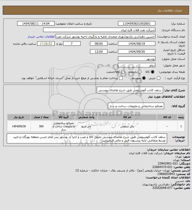 | 1 | -- | پانل سقفی | متر مربع | مصالح ساختمانی و ملزومات ساخت و ساز | 500 | 1404/09/30 |