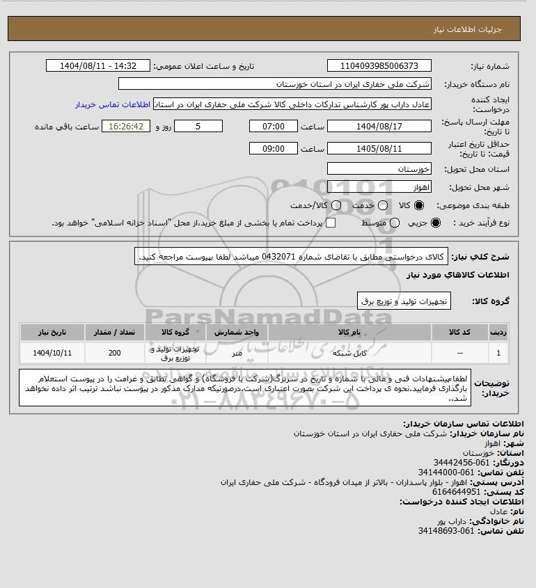 شرح کلی نیاز: کالای درخواستی مطابق با تقاضای شماره 0432071 میباشد لطفا بپیوست مراجعه کنید.