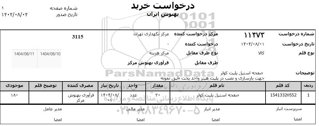 | 1 | 15413320552 | صفحه استیل پلیت کولر | 30 | عدد | 1404.8.1 | فرآوری بهنوش مرکز | 180 |