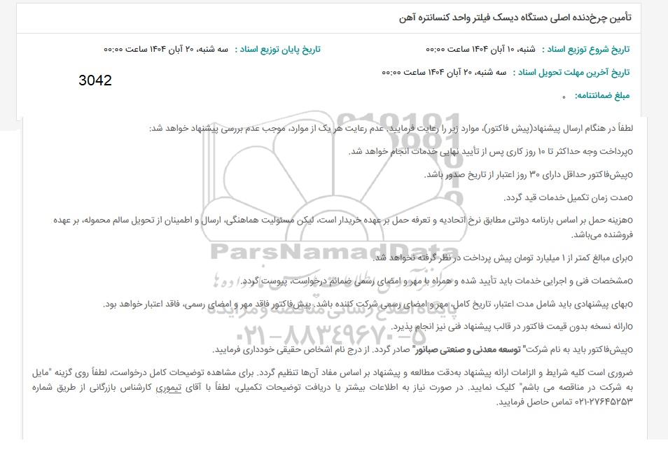 استعلام بها و موضوع استعلام استعلام تامین چرخ دنده اصلی دستگاه دیسک فیلتر واحد کنسانتره آهن به اطلاع کلیه شرکتها و افراد متخصص واجد شرایط میرساند، آگهی گذار در نظر دارد از طریق استعلام بها، نسبت به انتخاب و دریافت پیشنهادات اقدام نماید. این استعلام با کد آگهی ثبت شده در سامانه خبرگزاری پارس نماد : 9788408 منتشر شده است. مشخصات استعلام : تاریخ شروع استعلام: 1404/08/11 آخرین مهلت ارسال پیشنهاد قیمت : 1404/08/20 و محل اجرای پروژه : استان تهران میباشد. استعلام قیمت مورد درخواست : استعلام تامین چرخ دنده اصلی دستگاه دیسک فیلتر واحد کنسانتره آهن با دستهبندیهای تخصصی و گروه های مرتبط : انواع فیلتر های تصفیه, قطعات چدنی و فولادی, ماشین کاری, تجهیزات و ماشین آلات صنعتی, تجهیزات و ماشین آلات حفاری, استعلام اطلاع رسانی میگردد.