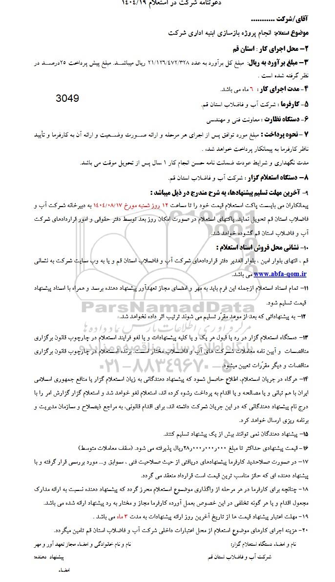 8- دستگاه استعلام گزار: شرکت آب و فاضلاب استان قم.