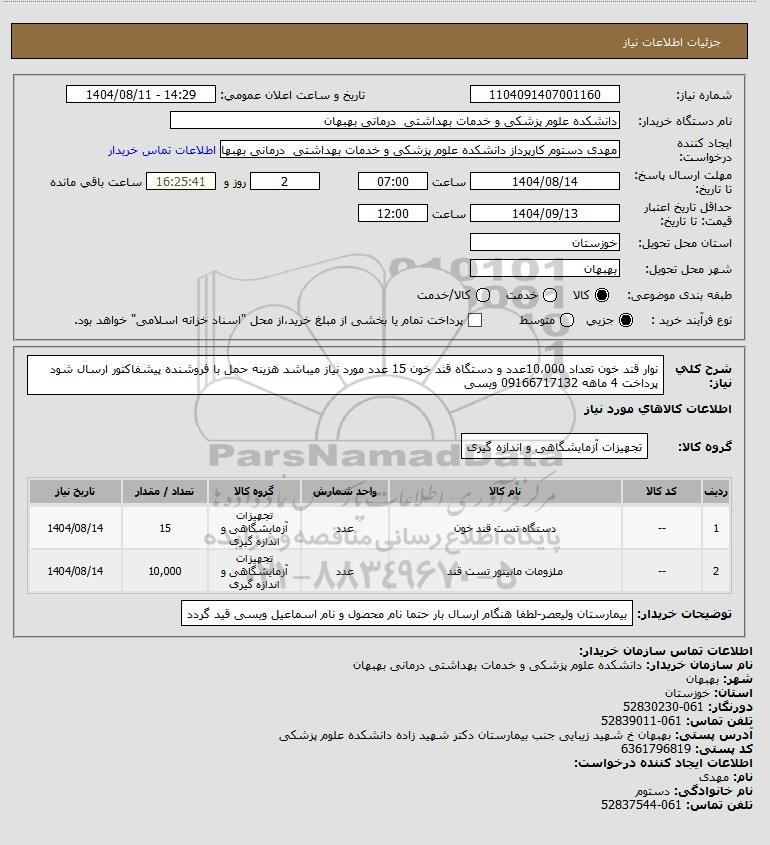 شرح کلی نیاز: نوار قند خون تعداد 10،000عدد و دستگاه قند خون 15 عدد مورد نیاز میباشد هزینه حمل با فروشنده پیشفاکتور ارسال شود پرداخت 4 ماهه 09166717132 ویسی