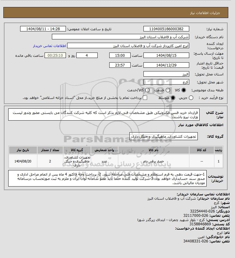 | 1 | -- | حصار برقی دام | عدد | تجهیزات کشاورزی، ماهیگیری و جنگل داری | 2 | 1404/08/20 |