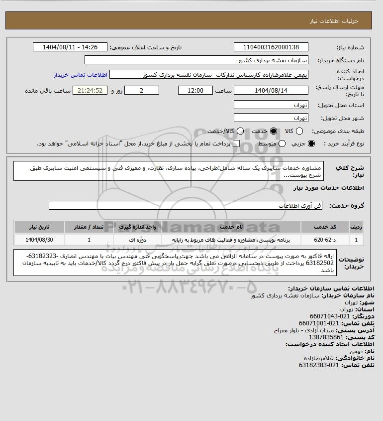 شرح کلی نیاز: مشاوره خدمات سایبری یک ساله شامل:طراحی، پیاده سازی، نظارت، و ممیزی فنی و سیستمی امنیت سایبری طبق شرح پیوست...