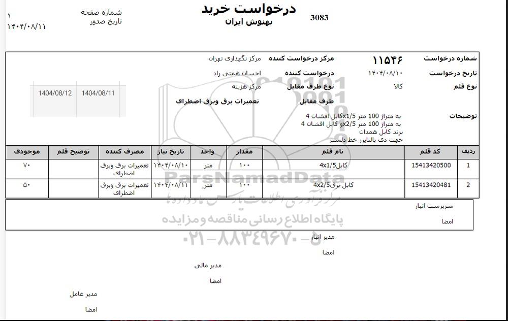 | 2 | 15413420481 | کابل برق 2.5*4 | 100 | متر | 1404.8.11 | تعمیرات برق و برق اضطراری | 50 |