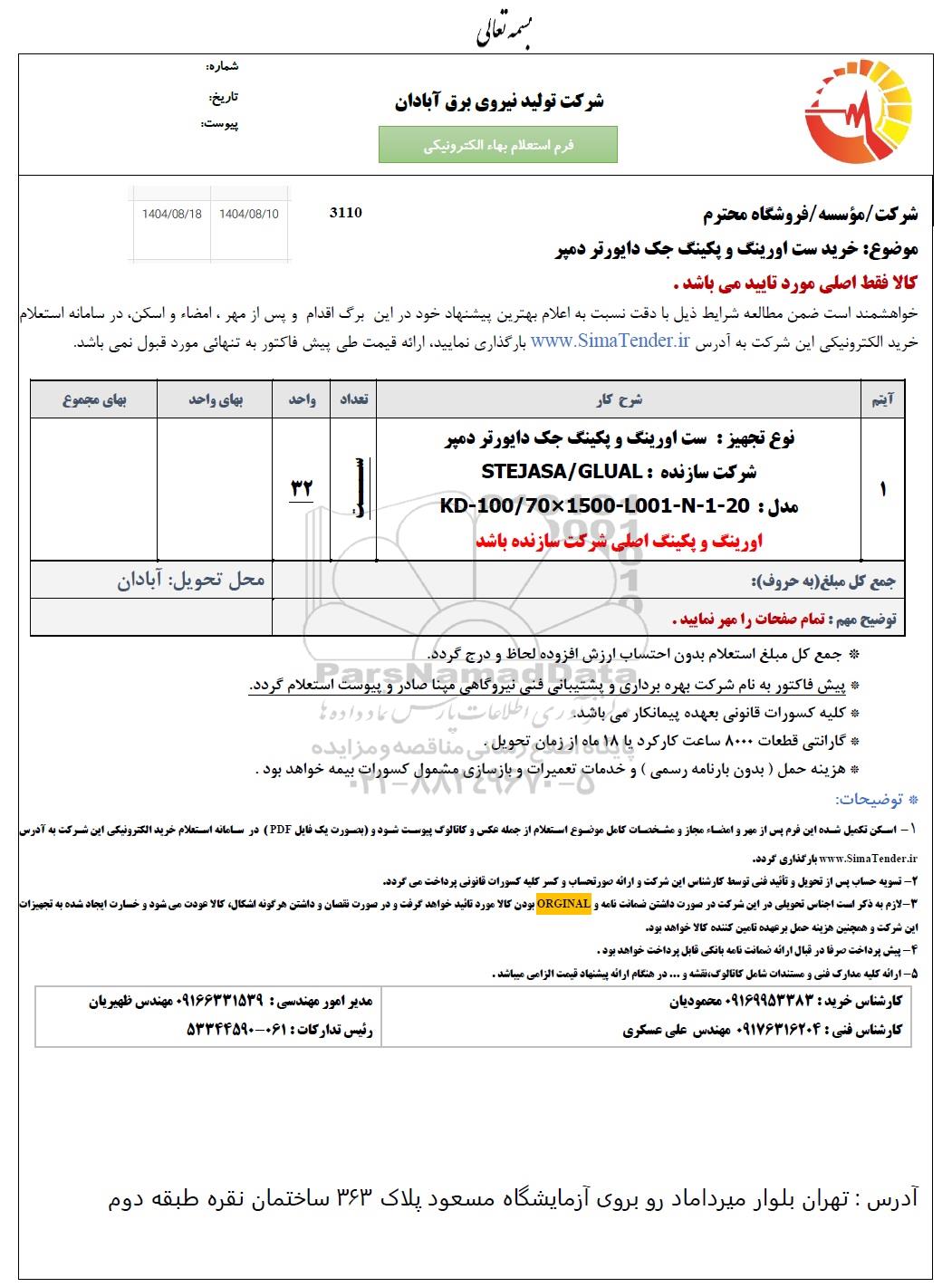 خواهشمند است ضمن مطالعه شرایط ذیل با دقت نسبت به اعلام بهترین پیشنهاد خود در این برگ اقدام و پس از مهر ، امضاء و اسکن در سامانه استعلام خرید الکترونیکی این شرکت به آدرس www.SimaTender.ir بارگذاری نمایید ارائه قیمت طی پیش فاکتور به تنهایی مورد قبول نمی باشد.