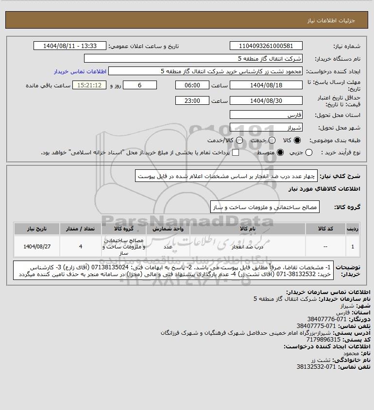 شرح کلی نیاز: چهار عدد درب ضد انفجار بر اساس مشخصات اعلام شده در فایل پیوست