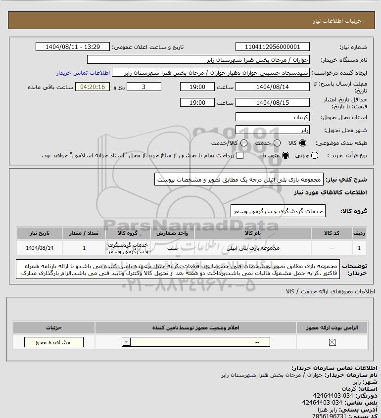 | 1 | -- | مجموعه بازی پلی اتیلن | ست | خدمات گردشگری و سرگرمی وسفر | 1 | 1404/08/14 |