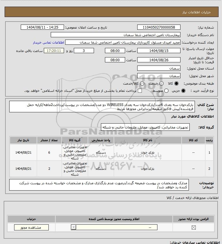 شرح کلی نیاز: بارکدخوان سه بعدی 6عدد/بارکدخوان سه بعدی WIRELESS دو عدد/مشخصات در پیوست/پرداخت2ماهه/کرایه حمل فروشنده/پیش فاکتور ضمیمه/برندایرانی مجوزها مرتبط