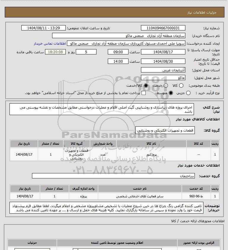 استعلام بها و موضوع استعلام استعلام اجرای پروژه های زیباسازی و روشناییی گیت اصلی اقلام و عملیات درخواستی مطابق مشخصات و نقشه پیوستی می باشد به اطلاع کلیه شرکتها و افراد متخصص واجد شرایط میرساند، آگهی گذار در نظر دارد از طریق استعلام بها، نسبت به انتخاب و دریافت پیشنهادات اقدام نماید. این استعلام با کد آگهی ثبت شده در سامانه خبرگزاری پارس نماد : 9788558 منتشر شده است. مشخصات استعلام : تاریخ شروع استعلام: 1404/08/11 آخرین مهلت ارسال پیشنهاد قیمت : 1404/08/17 و محل اجرای پروژه : استان آذربایجان غربی میباشد. استعلام قیمت مورد درخواست : استعلام اجرای پروژه های زیباسازی و روشناییی گیت اصلی اقلام و عملیات درخواستی مطابق مشخصات و نقشه پیوستی می باشد با دستهبندیهای تخصصی و گروه های مرتبط : پیمانکاری برق و الکترونیک, صنایع روشنایی, نورپردازی, تجهیزات برق و الکترونیک, استعلام اطلاع رسانی میگردد.