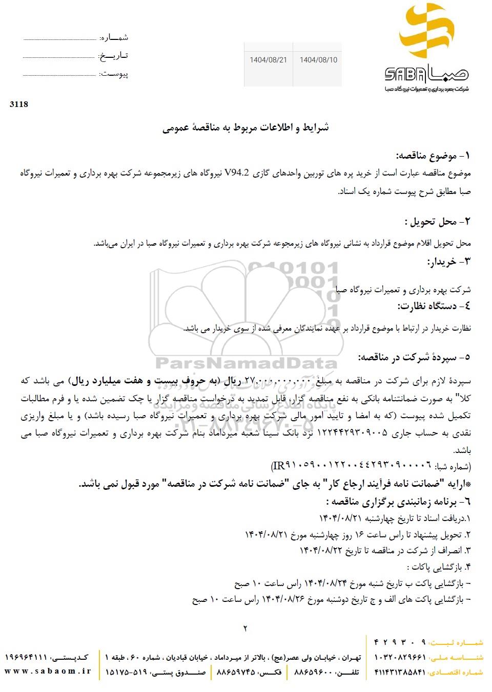 موضوع مناقصه عبارت است از خرید پره های توربین واحدهای گازی V94.2 نیروگاههای زیر مجموعه شرکت بهره برداری و تعمیرات نیروگاه صبا مطابق شرح پیوست شماره یک استاد.