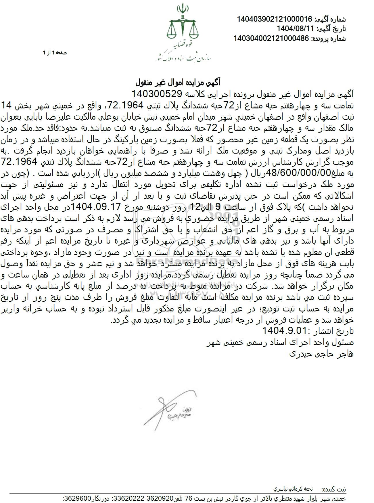 تمامت سه و چهار هفتم حبه مشاع از 72 حبه ششدانگ پلاك ثبتي 72.1964 واقع در خميني شهر بخش 14 ثبت اصفهان واقع در اصفهان خمینی شهر میدان امام خمینی نبش خیابان بوعلى مالكيت علیرضا بابایی بعنوان مالک مقدار سه و چهار هفتم حبه مشاع از 72 حبه ششدانگ مسبوق به ثبت میباشد به حدود : فاقد حد ملک مورد نظر بصورت یک قطعه زمین غیر محصور که فعلا بصورت زمین پارکینگ در حال استفاده میباشد و در زمان بازدید اصل و مدارک ثبتی و موقعیت ملک ارائه نشد و صرفا با راهنمایی خواهان بازدید انجام گرفت . به. موجب گزارش کارشناس ارزش تمامت سه و چهار هفتم حبه مشاع از 72 ح به ششدانگ پلاك ثبتي 72.1964 به مبلغ 48.600.000.00 ریال (چهل و هشت میلیارد و ششصد میلیون ریال) ارزیابی شده است . (چون در مورد ملک درخواست ثبت نشده اداره تکلیفی برای تحویل مورد انتقال تدارد و نیز مسئولیتی از جهت اشکالاتی که ممکن است در حین پذیرش تقاضای ثبت و یا بعد از آن از جهت اعتراض و غیره پیش آید نخواهد داشت) که پلاک فوق از ساعت 9 الی 12 روز دوشنبه مورخ 1404.09.17 در محل واحد اجرای اسناد رسمی خمینی شهر از طریق مزایده حضوری به فروش مي رسد لازم به ذکر است پرداخت بدهی های مربوط به آب و برق و گاز اعم از حق انشعاب و یا حق اشتراک و مصرف در صورتی که مورد مزایده دارای آنها باشد و نیز بدهیهای مالیاتی و عوارض شهرداری و غیره تا تاریخ مزایده اعم از اینکه رقم قطعی آن معلوم شده یا نشده باشد به عهده برنده مزایده است و نیز در صورت وجود مازاد ، وجوه پرداختی بابت هزینه های فوق از محل مازاد به برنده مزایده مسترد خواهد شد و نیم عشر و حق مزايده نقداً وصول میگردد ضمنا چنانچه روز مزایده تعطیل رسمی گردد مزایده روز اداری بعد از تعطیلی در همان ساعت و مکان برگزار خواهد شد شرکت در مزایده منوط به پرداخت ده درصد از مبلغ پایه کارشناسی به حساب سپرده ثبت می باشد برنده مزایده مکلف است ما به التفاوت مبلغ فروش را ظرف مدت پنج روز از تاریخ مزایده به حساب ثبت تودیع در غیر اینصورت مبلغ مذکور قابل استرداد نبوده و به حساب خزانه واریز خواهد شد و عملیات فروش از درجه اعتبار ساقط و مزایده تجدید می گردد.