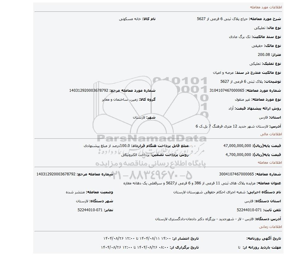 مزایده عمومی مزایده پلاک ثبتی 6 فرعی از 5627 برگزار میگردد. از کلیه افراد متخصص و شرکتهای واجد شرایط دعوت به عمل میآید تا در این مزایده با کد خبرگزاری پارس نماد : 9788593 شرکت نمایند تاریخ شروع مزایده : 1404/08/11 مهلت شرکت در مزایده: تا پایان روز 1404/08/26 مکان برگزاری اموال واگذاری استانهای فارس و دستهبندیهای مربوط به این حراجی املاک و زمین میباشد.