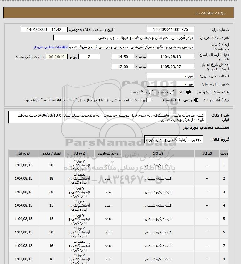 شرح کلی نیاز: کیت وملزومات بخش آزمایشگاهی به شرح فایل پیوستی-درصورت ارائه برندجدیدارسال نمونه تا 1404/08/13جهت دریافت تاییدیه از مرکز ورعایت قوانین
