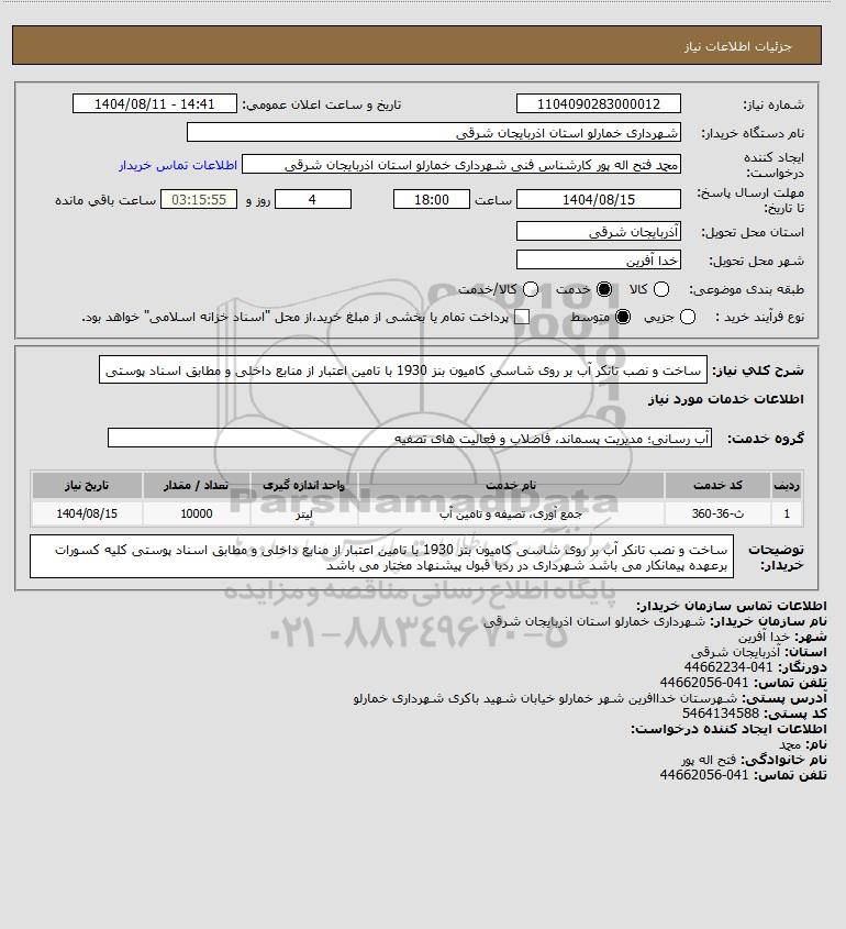 شرح کلی نیاز: ساخت و نصب تانکر آب بر روی شاسی کامیون بنز 1930 با تامین اعتبار از منابع داخلی و مطابق اسناد پوستی