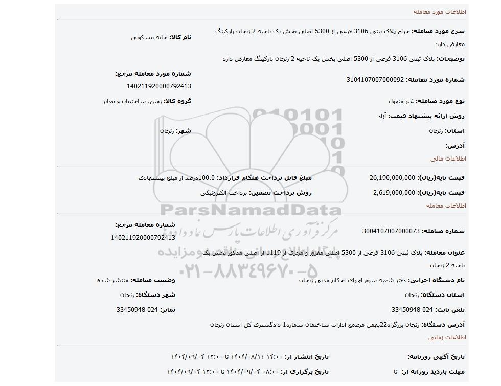| شرح مورد معامله: حراج پلاک ثبتی 3106 فرعی از 5300 اصلی بخش یک ناحیه 2 زنجان پارکینگ معارض دارد | نام کالا: خانه مسکونی | |