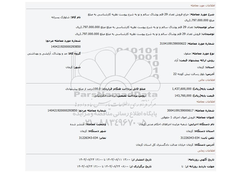 | سایر توضیحات: تعداد 29 قلم پوشاک سالم و نو به شرح پیوست نظریه کارشناسی به مبلغ مبلغ 1.797.000.000ریال | ||