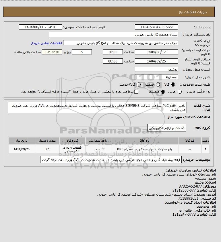 شرح کلی نیاز: تامین اقلام PLC ساخت شرکت SIEMENS مطابق با لیست پیوست و رعایت شرایط خرید.عضویت در AVL وزارت نفت ضروری می باشد.