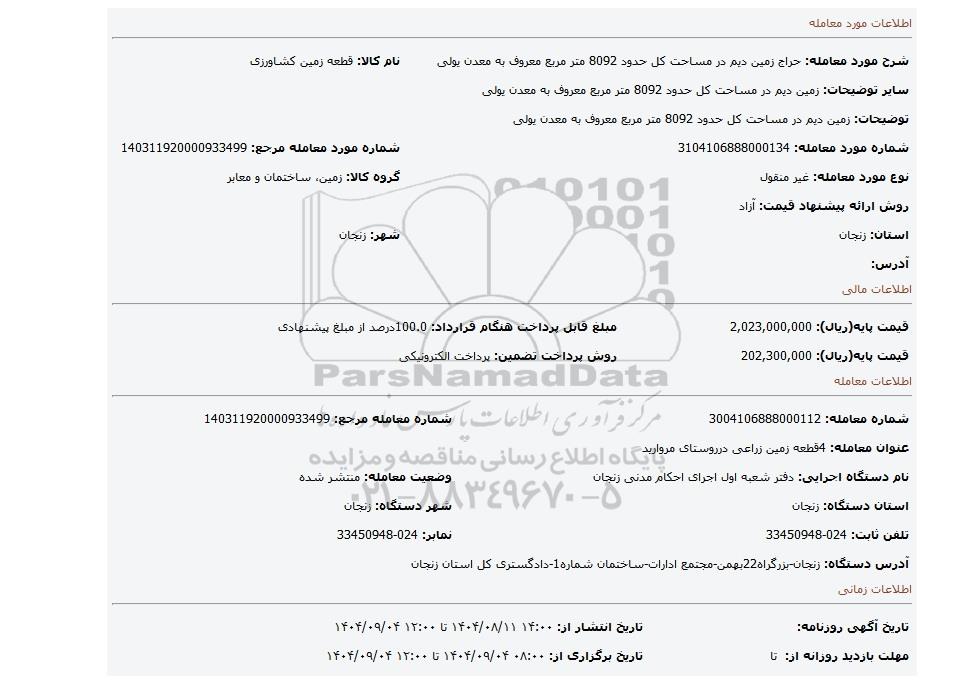 مزایده عمومی مزایده زمین دیم در مساحت کل حدود 8092 متر مربع معروف به معدن یولی برگزار میگردد. از کلیه افراد متخصص و شرکتهای واجد شرایط دعوت به عمل میآید تا در این مزایده با کد خبرگزاری پارس نماد : 9788637 شرکت نمایند تاریخ شروع مزایده : 1404/08/11 مهلت شرکت در مزایده: تا پایان روز 1404/09/04 مکان برگزاری اموال واگذاری استانهای زنجان و دستهبندیهای مربوط به این حراجی ماشین آلات و تجهیزات کشاورزی و دام پروری, املاک و زمین میباشد.