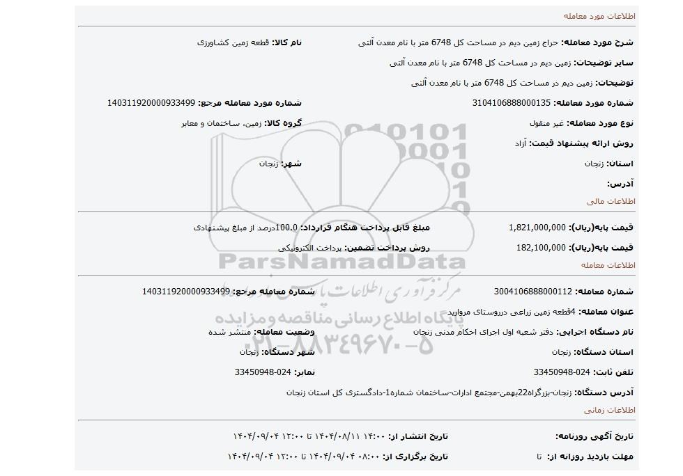 مزایده عمومی مزایده زمین دیم در مساحت کل 6748 متر با نام معدن آلتی برگزار میگردد. از کلیه افراد متخصص و شرکتهای واجد شرایط دعوت به عمل میآید تا در این مزایده با کد خبرگزاری پارس نماد : 9788638 شرکت نمایند تاریخ شروع مزایده : 1404/08/11 مهلت شرکت در مزایده: تا پایان روز 1404/09/04 مکان برگزاری اموال واگذاری استانهای زنجان و دستهبندیهای مربوط به این حراجی ماشین آلات و تجهیزات کشاورزی و دام پروری, املاک و زمین میباشد.