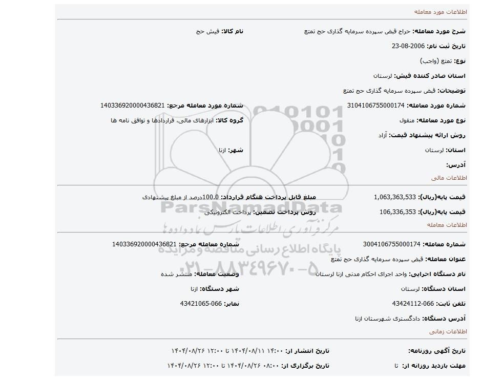 | شرح مورد معامله: حراج قبض سپرده سرمایه گذاری حج تمتع | نام کالا: فیش حج | |