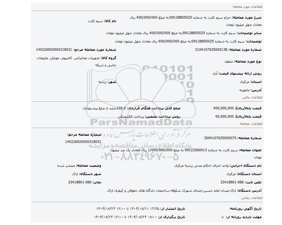 | توضیحات: سیم کارت به شماره 09128855025:به مبلغ 400/000/000 ریال معادل چهل میلیون تومان | ||