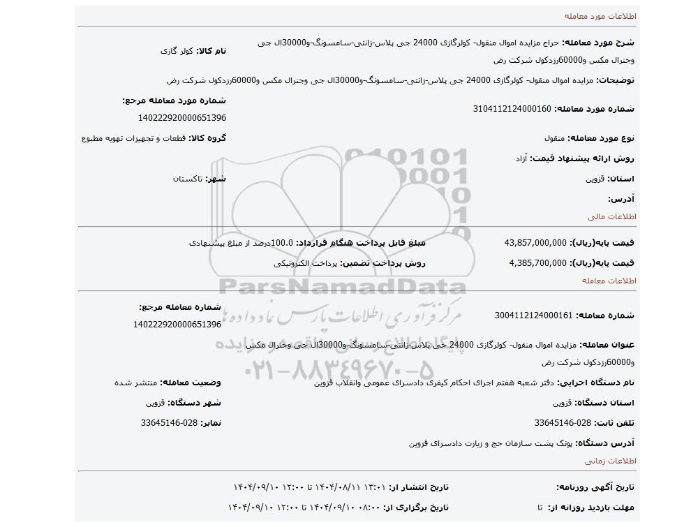 | عنوان معامله: مزایده اموال منقول- کولرگازی 24000 جی پلاس-زانتی-سامسونگ-و30000ال جی وجنرال مکس و60000رزدکول شرکت رض | ||