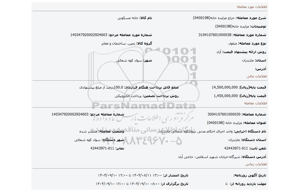 | عنوان معامله: مزایده خانه (0400198) | ||