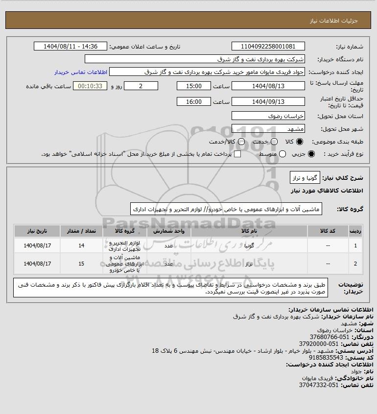 | 1 | -- | گونیا | عدد | لوازم التحریر و تجهیزات اداری | 14 | 1404/08/17 |