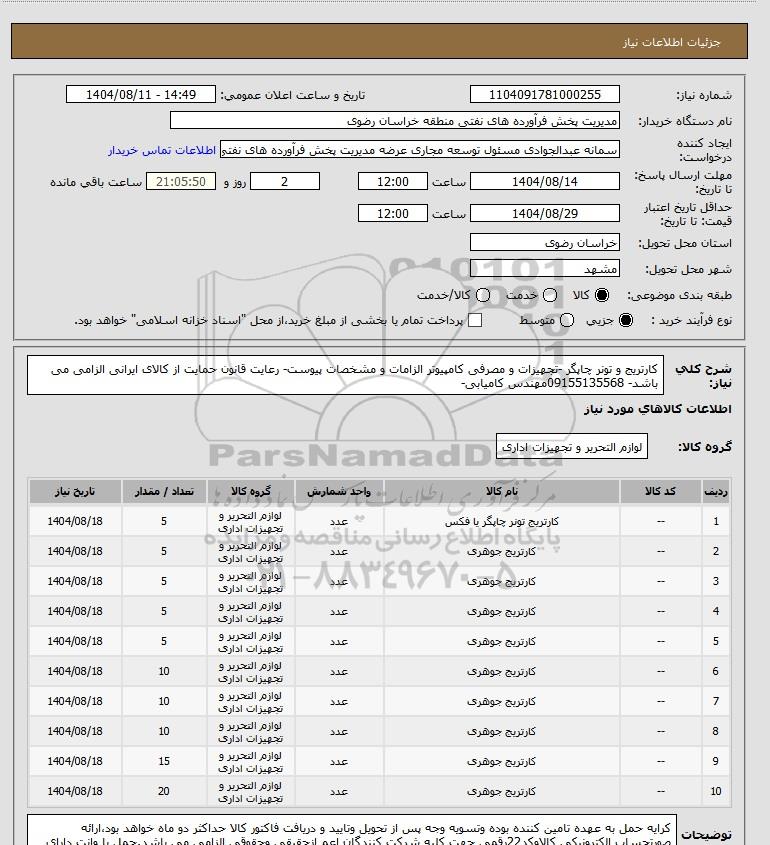 | 8 | -- | کارتریج جوهری | عدد | لوازم التحریر و تجهیزات اداری | 10 | 1404/08/18 |