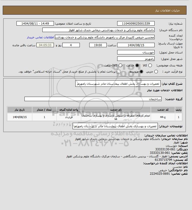 شرح کلی نیاز: تعمیرات و بهسازی بخش اطفال بیمارستان مادر شهرستان رامهرمز