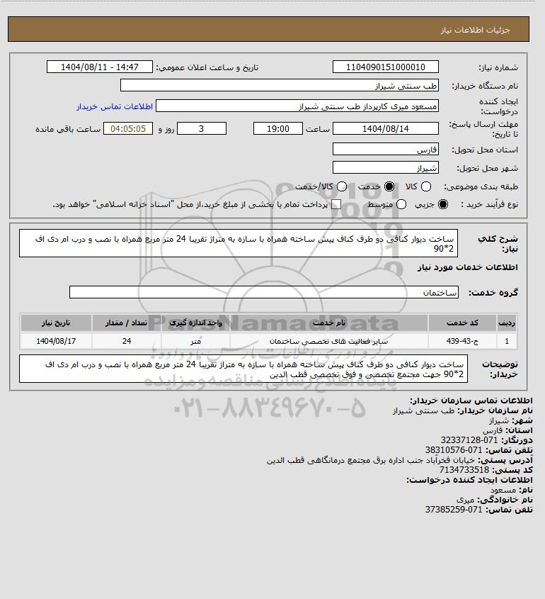 استعلام بها و موضوع استعلام استعلام ساخت دیوار کنافی دو طرف کناف پیش ساخته همراه با سازه به متراژ تقریبا 24 متر مربع همراه با نصب و درب ام دی اف 2*90 به اطلاع کلیه شرکتها و افراد متخصص واجد شرایط میرساند، آگهی گذار در نظر دارد از طریق استعلام بها، نسبت به انتخاب و دریافت پیشنهادات اقدام نماید. این استعلام با کد آگهی ثبت شده در سامانه خبرگزاری پارس نماد : 9788730 منتشر شده است. مشخصات استعلام : تاریخ شروع استعلام: 1404/08/11 آخرین مهلت ارسال پیشنهاد قیمت : 1404/08/14 و محل اجرای پروژه : استان فارس میباشد. استعلام قیمت مورد درخواست : استعلام ساخت دیوار کنافی دو طرف کناف پیش ساخته همراه با سازه به متراژ تقریبا 24 متر مربع همراه با نصب و درب ام دی اف 2*90 با دستهبندیهای تخصصی و گروه های مرتبط : دکوراسیون داخلی, سازه های فلزی و فضایی, مصنوعات چوبی و مبلمان اداری, دیوار و قطعات پیش ساخته, ساختمان, استعلام اطلاع رسانی میگردد.