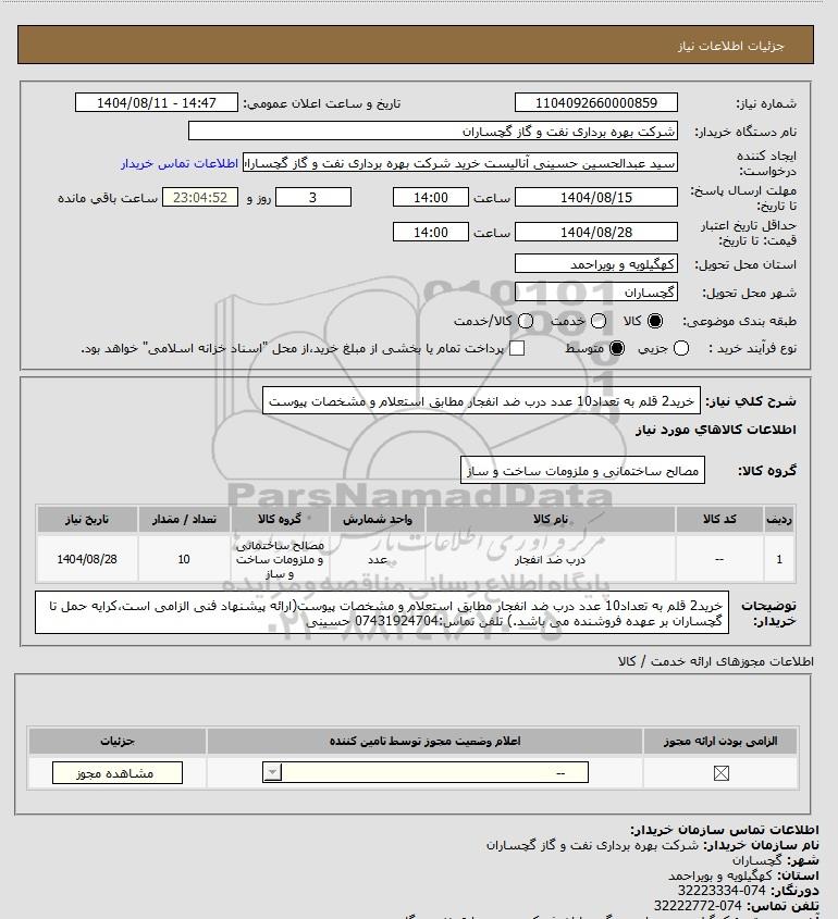 توضیحات خریدار:خرید2 قلم به تعداد10 عدد درب ضد انفجار مطابق استعلام و مشخصات پیوست(ارائه پیشنهاد فنی الزامی است،کرایه حمل تا گچساران بر عهده فروشنده می باشد.) تلفن تماس:07431924704 حسینی