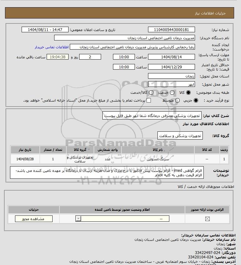 نام دستگاه خریدار:مدیریت درمان تامین اجتماعی استان زنجان