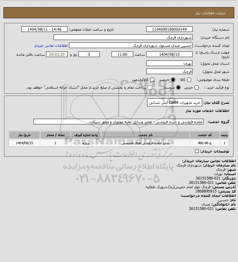 شرح کلی نیاز: خرید تجهیزات CBRM آتش نشانی