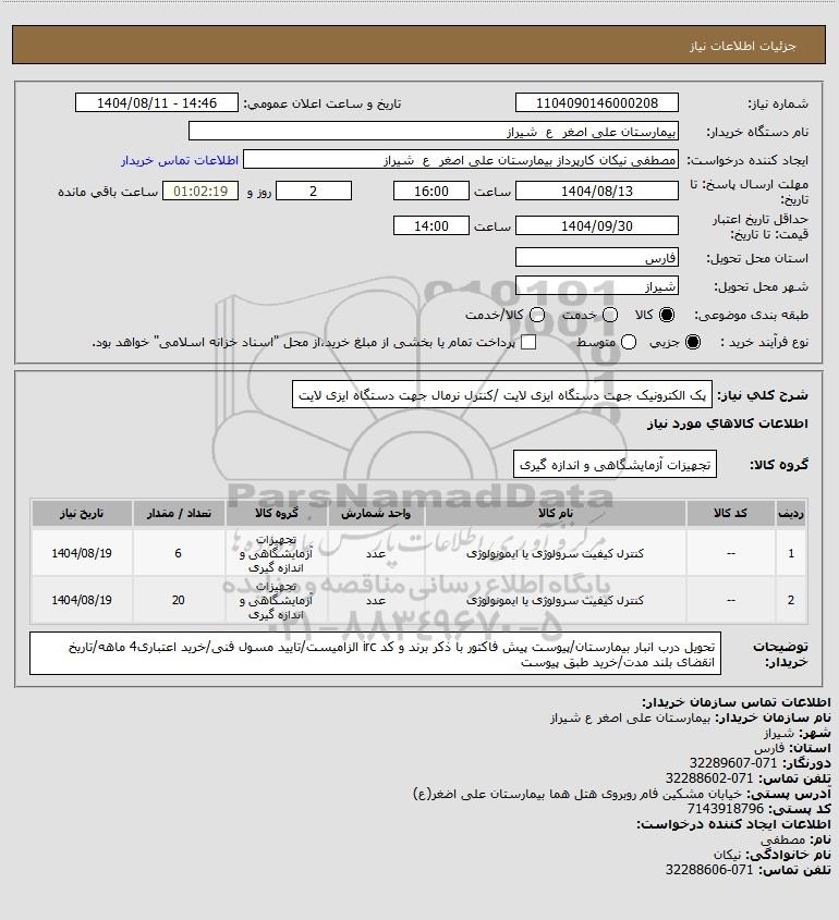 | 2 | -- | کنترل کیفیت سرولوژی یا ایمونولوژی | عدد | تجهیزات آزمایشگاهی و اندازه گیری | 20 | 1404/08/19 |