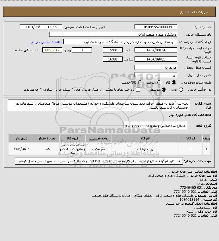 شرح کلی نیاز: تهیه بتن آماده به منظور اجرای فونداسیون ساختمان دانشکده واحد نور (مشخصات پیوست)
