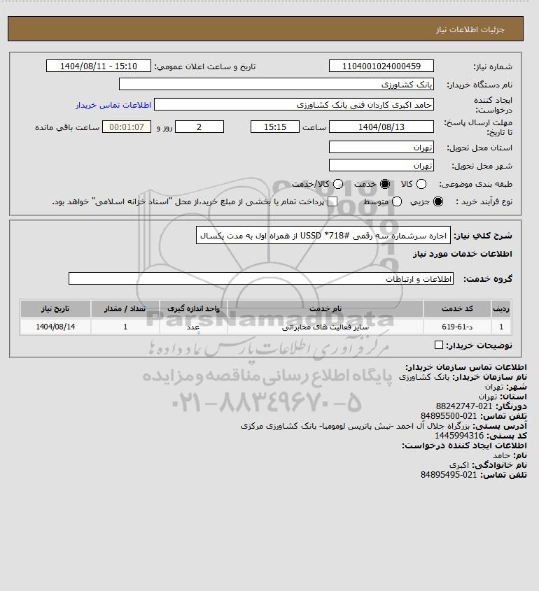 استعلام بها و موضوع استعلام استعلام اجاره سرشماره سه رقمی #718* USSD از همراه اول به مدت یکسال به اطلاع کلیه شرکتها و افراد متخصص واجد شرایط میرساند، آگهی گذار در نظر دارد از طریق استعلام بها، نسبت به انتخاب و دریافت پیشنهادات اقدام نماید. این استعلام با کد آگهی ثبت شده در سامانه خبرگزاری پارس نماد : 9788813 منتشر شده است. مشخصات استعلام : تاریخ شروع استعلام: 1404/08/11 آخرین مهلت ارسال پیشنهاد قیمت : 1404/08/13 و محل اجرای پروژه : استان تهران میباشد. استعلام قیمت مورد درخواست : استعلام اجاره سرشماره سه رقمی #718* USSD از همراه اول به مدت یکسال با دستهبندیهای تخصصی و گروه های مرتبط : پیمانکاری مخابرات, تجهیزات مخابرات, استعلام اطلاع رسانی میگردد.