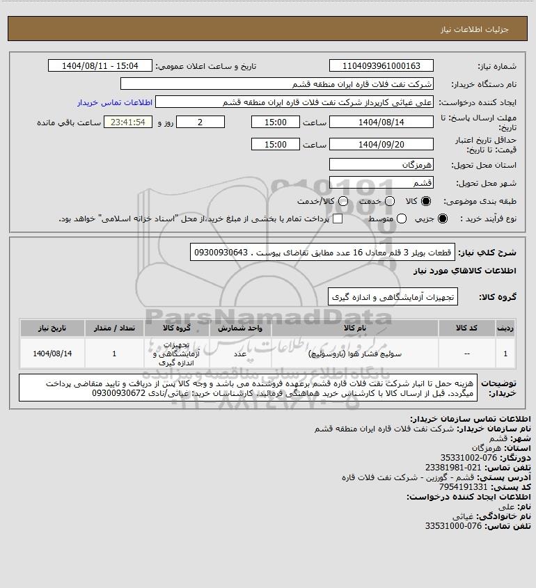 1 -- سوئیچ فشار هوا (باروسوئیچ) عدد تجهیزات آزمایشگاهی و اندازه گیری 1 1404/08/14