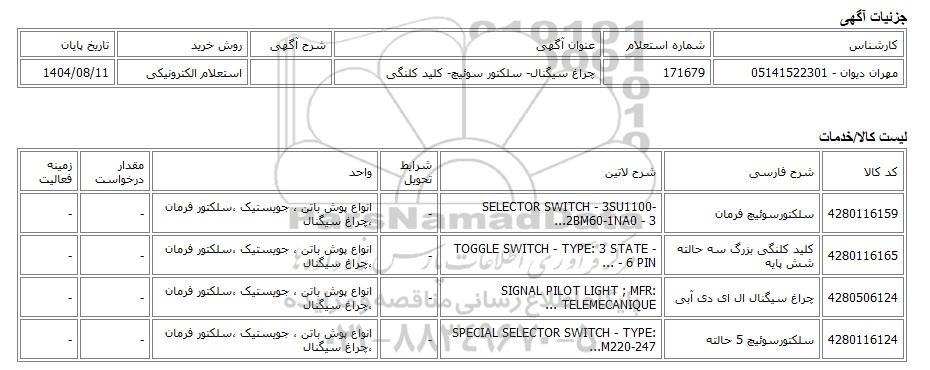 مهران دیوان - 05141522301171679چراغ سیگنال- سلکتور سوئیچ- کلید کلنگیاستعلام الکترونیکی1404/08/11