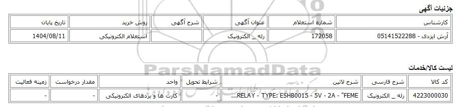 | آرش ایزدی - 05141522288 | 172058 | رله _ الکترونیک | استعلام الکترونیکی | 1404/08/11 |