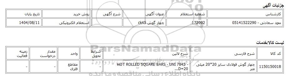 | محمد سعادتی - 05141522290 | 172092 | چهار گوش ck45 | استعلام الکترونیکی | 1404/08/11 |