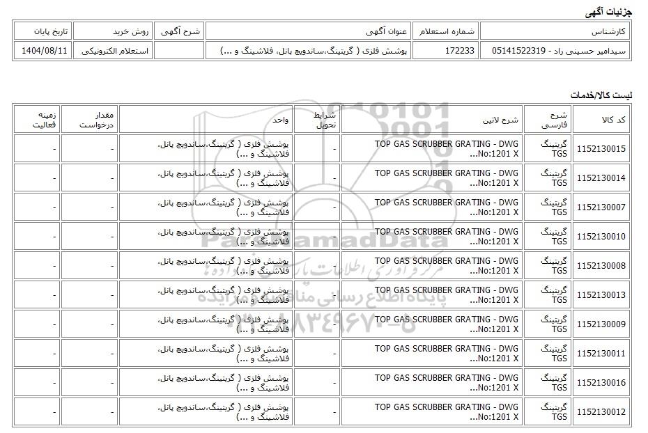 استعلام الکترونیکی پوشش فلزی ( گریتینگساندویچ پانل فلاشینگ و ...), استعلام الکترونیکی، پوشش فلزی ( گریتینگ،ساندویچ پانل، فلاشینگ و ...)