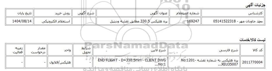 | محمد جاودان مهر - 05141522318 | 169247 | پره هلیکس 330.5 مطابق نقشه ودیتیل | استعلام الکترونیکی | 1404/08/14 |