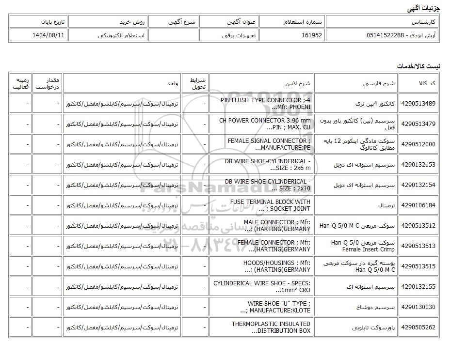 آرش ایزدی - 05141522288161952تجهیزات برقیاستعلام الکترونیکی1404/08/11