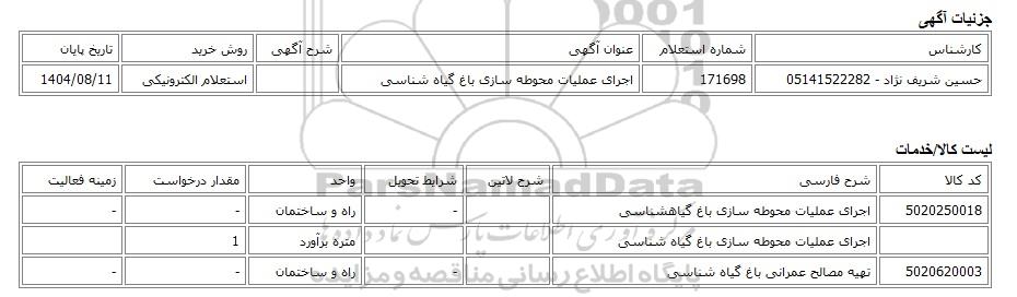حسین شریف نژاد - 05141522282171698اجرای عملیات محوطه سازی باغ گیاه شناسیاستعلام الکترونیکی1404/08/11